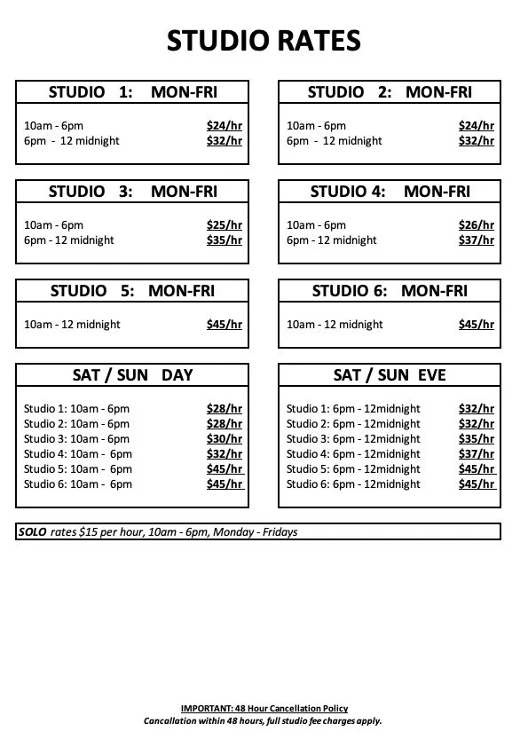 Pricing for each room varies on the size of the room and the time of day the rehearsal takes place. We have 3 booking times - anytime before 6pm, 6pm to 9pm and 9pm to 12am. Rehearsals before 6pm are cheaper than those after 6pm.